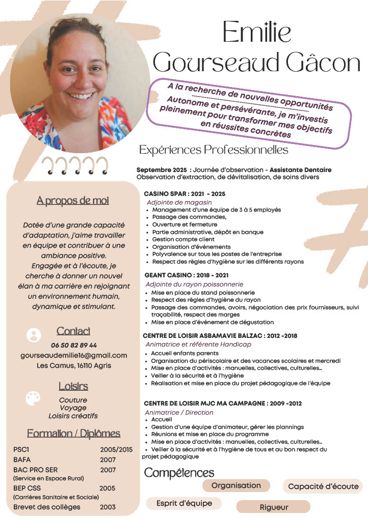 motivée et réfléchie. Actuellement en lien avec un centre de formation, je suis à la recherche d’une